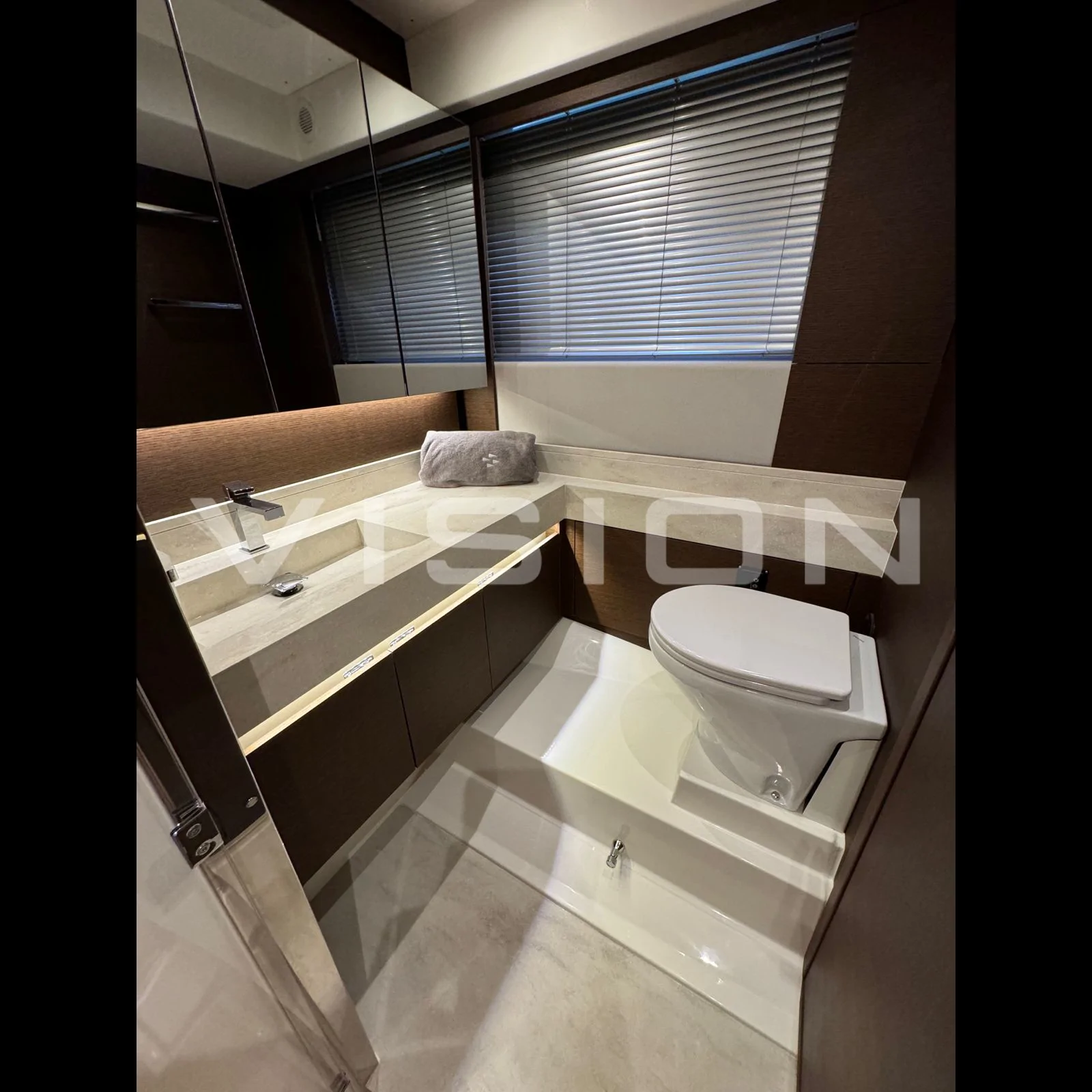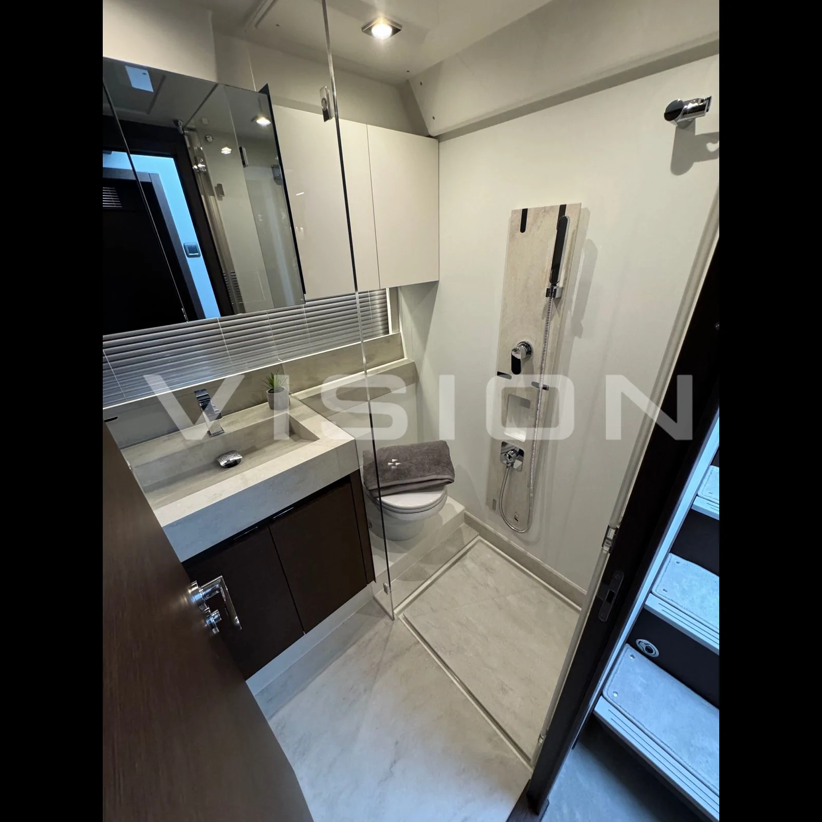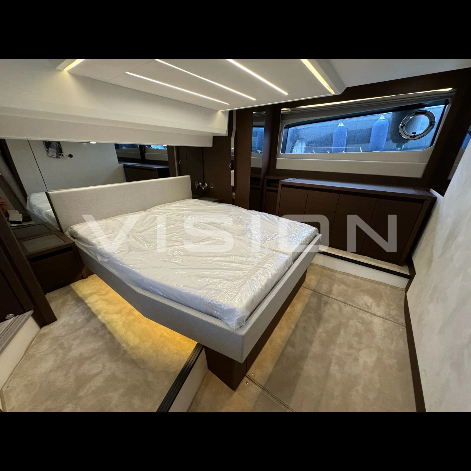 Bağımsız Master Kabin: Salonun arkasından özel bir girişle erişilen, teknenin tam genişliğini kullanan izole ve ultra lüks master süit.