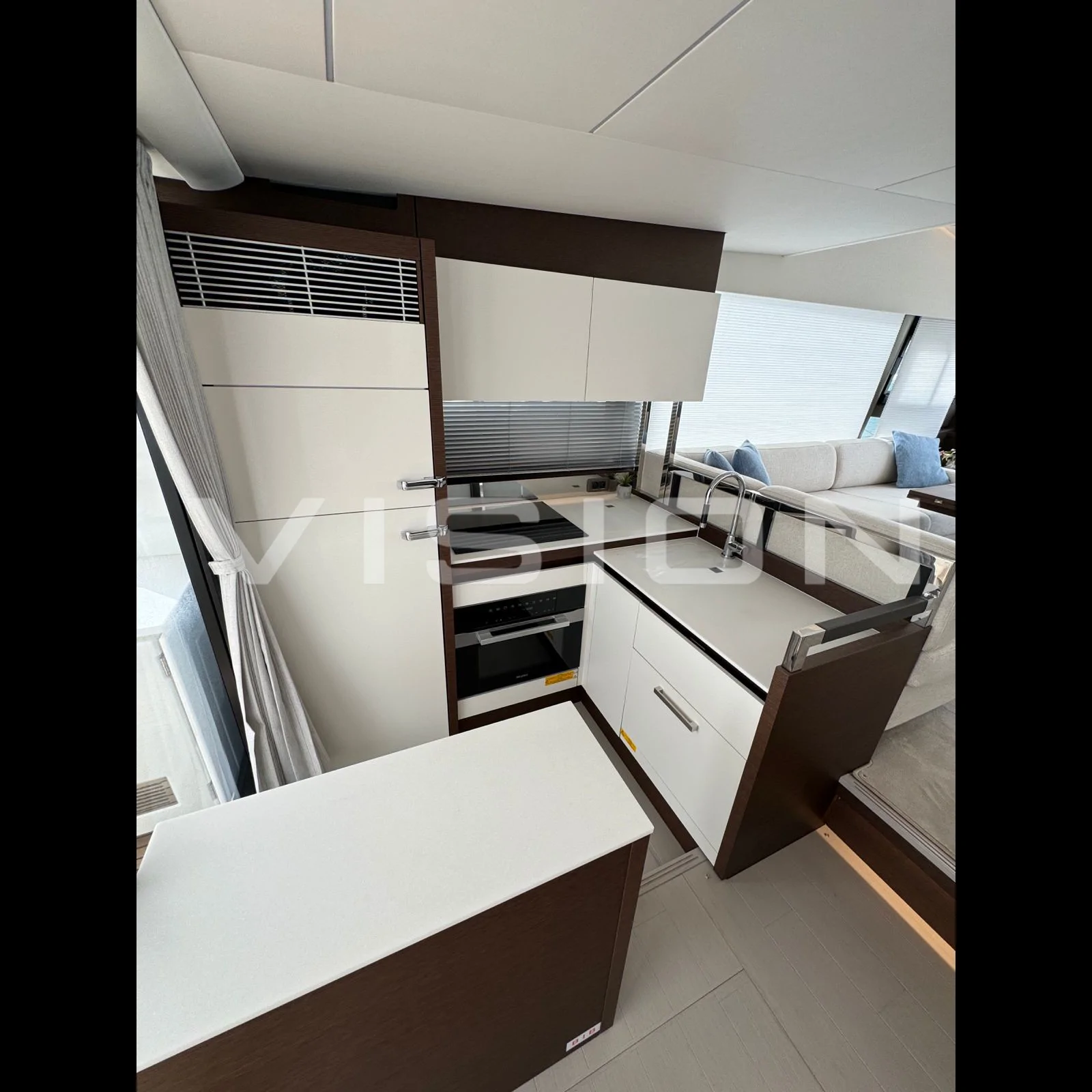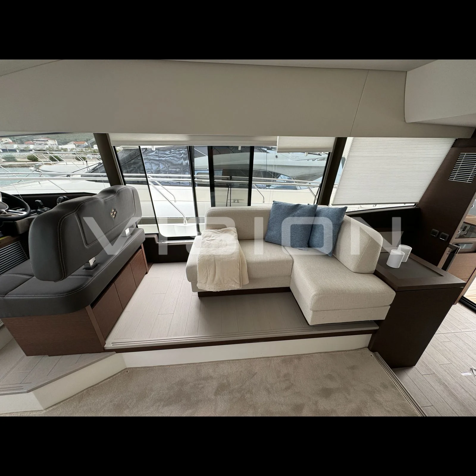 Panoramik Salon: 360 derece görüş açısı sunan geniş camlar ve kokpitle bütünleşen L tipi mutfak yerleşimi.